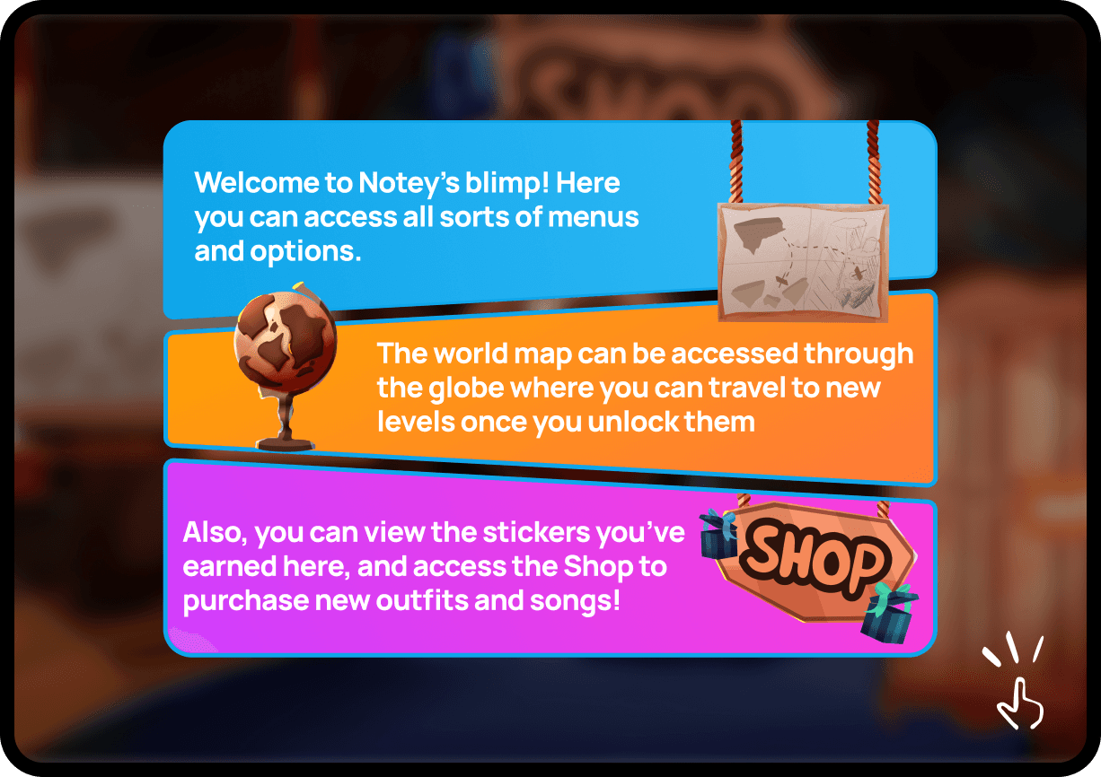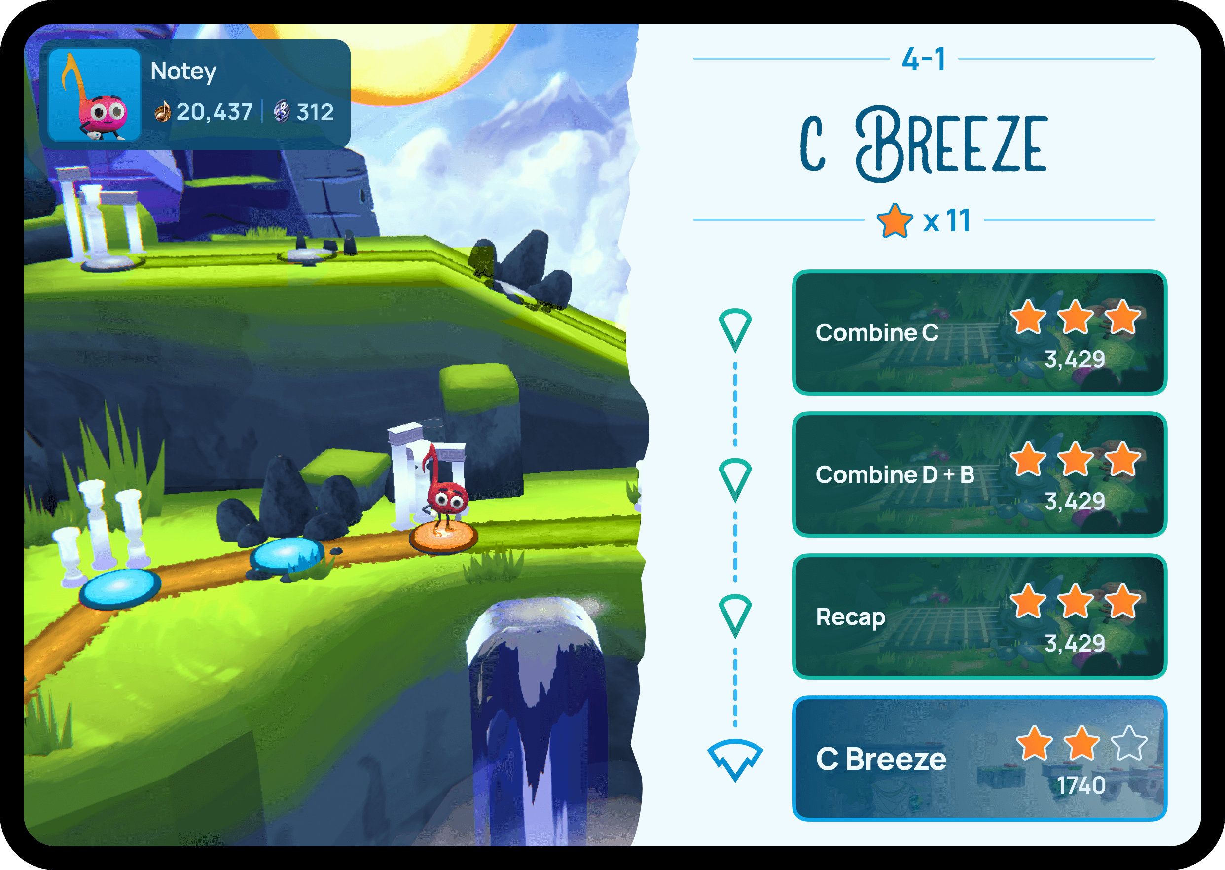 Notey's World adapts to your skill level and gives you challenges exactly when you're ready for them, and rewards you for seeking out additional levels of challenge. The game follows a carefully crafted curriculum but also takes your performance data and crafts supplemental levels to round out your understanding of topics.