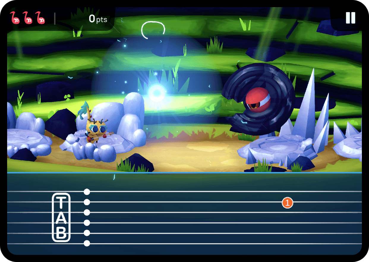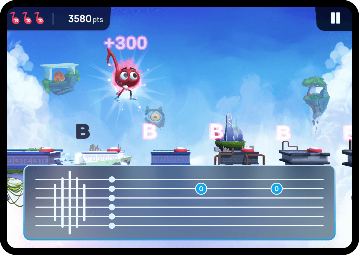 The music learning experience is gamified from the ground up in a way that students can follow and be engaged with at exactly their own pace. Sight reading exercises turn into platformer levels that combine technical skill development with engaging games that comfortably guide players through complex topics.